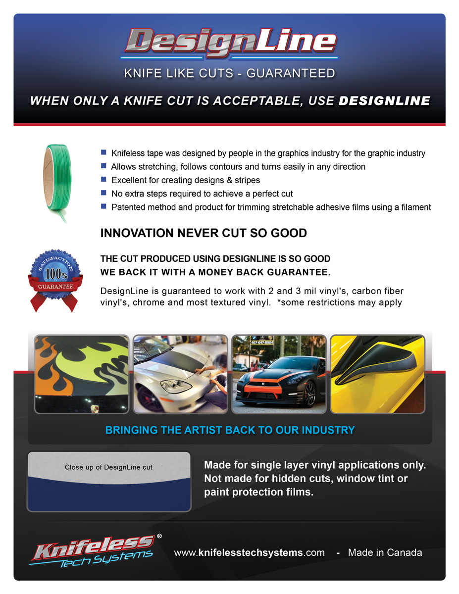 Taśma Knifeless DESIGN LINE służy do przycinania folii samoprzylepnych bezpośrednio na oklejanych pojazdach lub witrynach. Taśma jest bardzo łatwa w użytkowaniu, taśmą można łączyć folię do folii lub na zakładkę z idealnym marginesem i precyzją. Bez trudu przetniemy nią nawet trzy warstwy folii samoprzylepnych, idealnie tnie także folie monomeryczną, folię polimerową i wylewaną. Dzięki taśmie Knifeless tape możesz być pewny że nie uszkodzisz lakieru samochodowego, a przycinanie folii jest dużo prostsze, szybsze i nie trzeba mieć umiejętności cięcia skalpelem. Z taśmy Knifless tape można formować kształty lub ciąć w linii prostej.